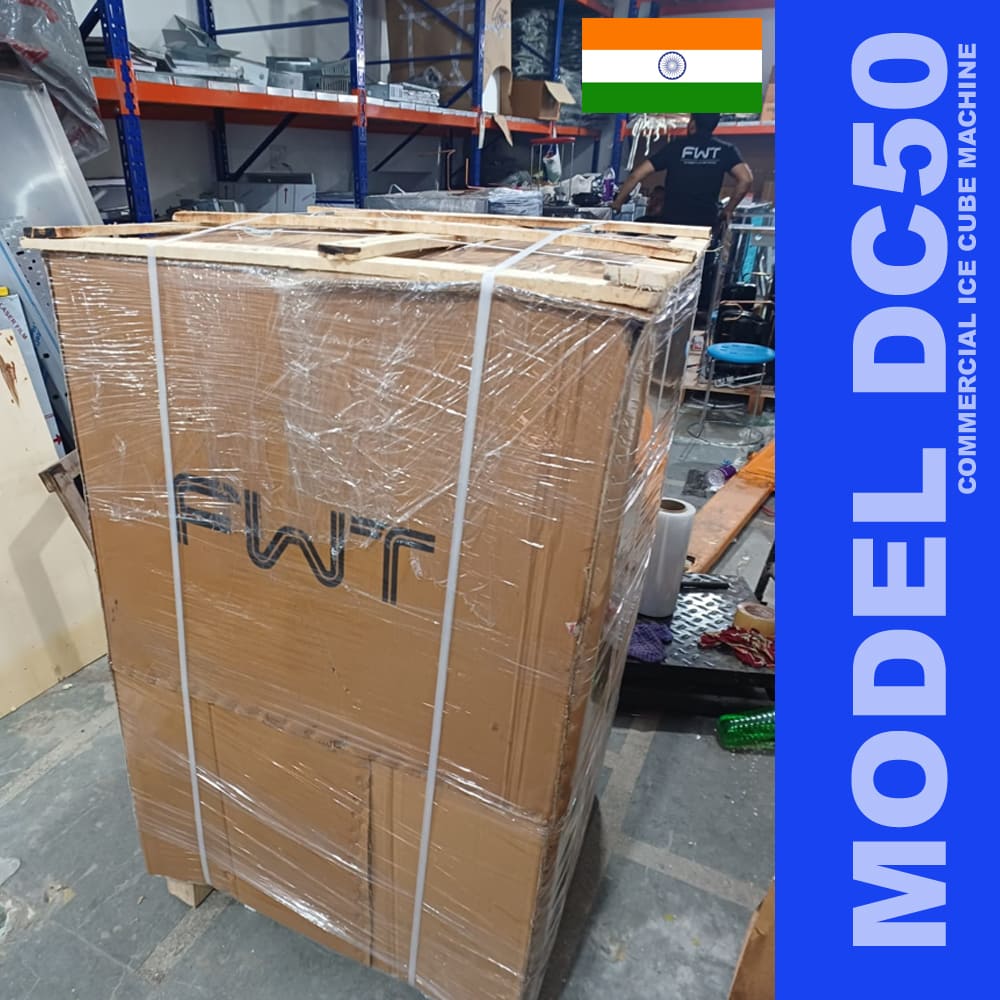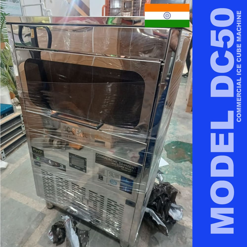 Our best selling model DCE50 50kg/day ice cube machine with solid dice shape cube it comes with fully automatic funcation it batch timming will be 16-18min on 45cubes each cube having 10gm of weight.